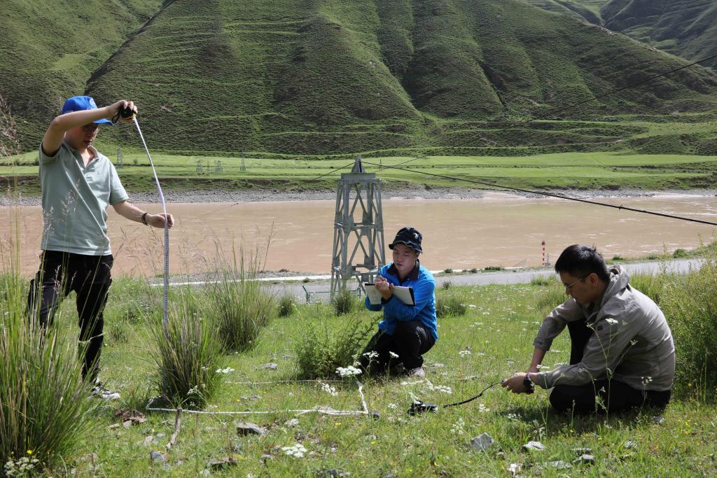 7月22日,长江科学院水土保持研究所的科考队员在通天河直门达河段进行植被样方调查。新华社记者刘诗平摄