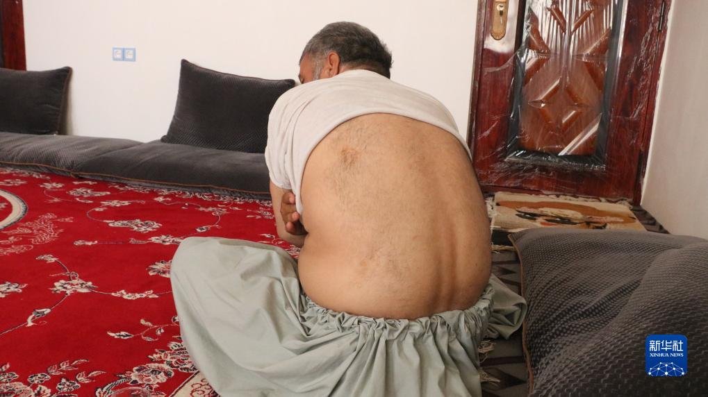 7月15日,在阿富汗赫拉特省赫拉特市沙提尔堡村,一名村民展示其在2001年美军集束炸弹袭击中留下的伤疤。新华社发(马沙勒摄)