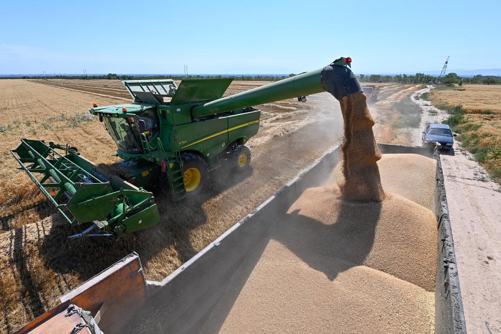 司张辉操作联合收割机在新疆呼图壁县二十里店镇宁州户村将小麦装车(7月15日摄)。新华社记者 丁磊 摄