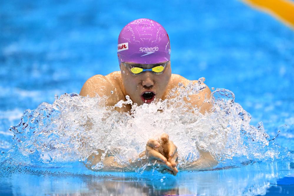 7月23日,中国选手覃海洋在男子100米蛙泳半决赛中。新华社记者 张笑宇 摄