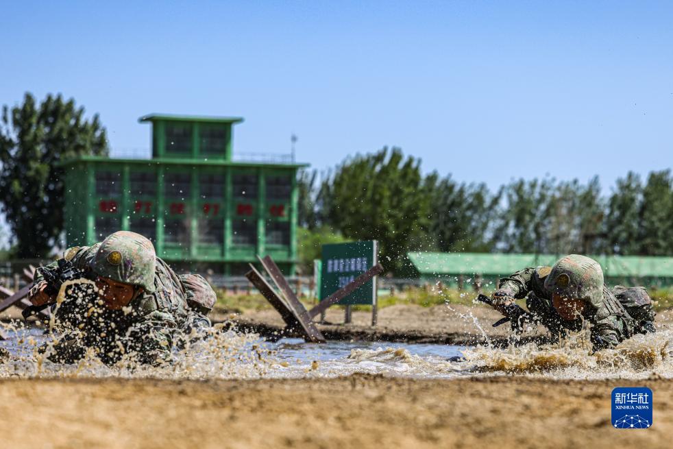 中部战区陆军第81集团军某旅“松骨峰特功连”进行单兵战术综合演练,官兵们快速通过涉水场(2023年6月9日摄)。新华社发(姜慧鑫 摄)
