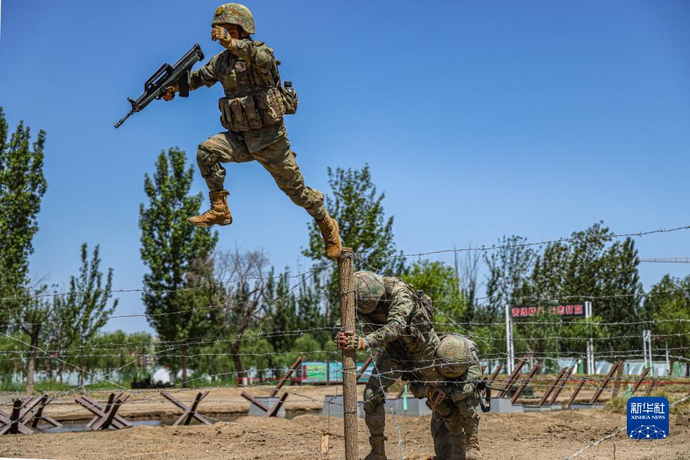 中部战区陆军第81集团军某旅“松骨峰特功连”组织官兵进行跨过铁丝网训练(2023年6月9日摄)。新华社发(姜慧鑫 摄)
