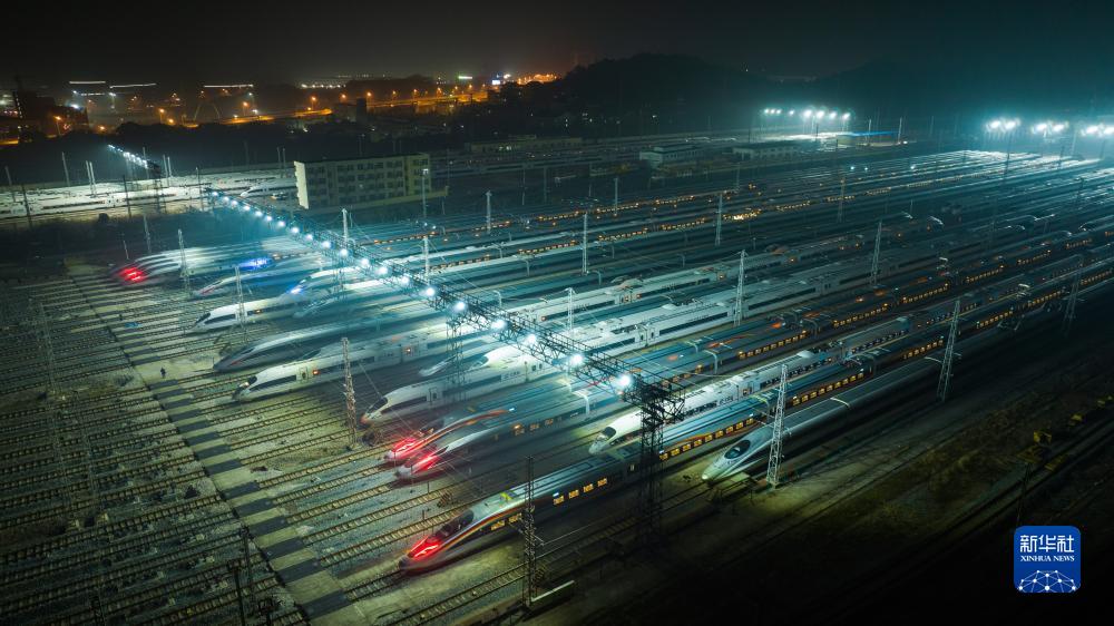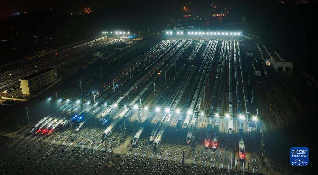 这是1月7日凌晨在长沙动车运用所拍摄的动车组列车(无人机照片)。新华社记者 陈思汗 摄