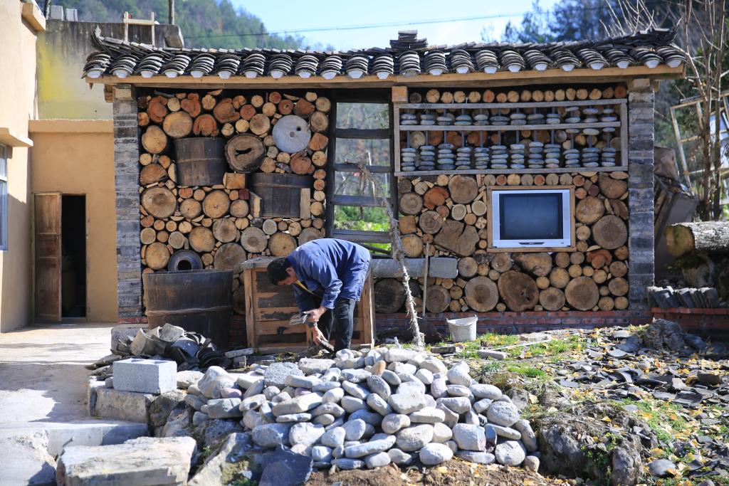 图为村民在院子里用废旧物品搭建的文化墙。(张文灿 摄)