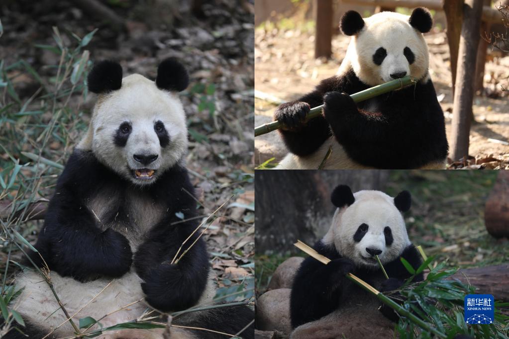 这是一张拼版照片:左图为大熊猫“科比”;右图为大熊猫“奥林匹亚”(右上)、大熊猫“福娃”(右下)。新华社发