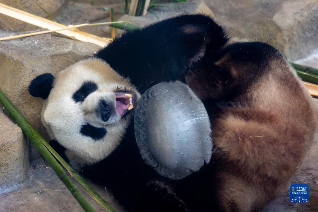 4月24日,在成都大熊猫繁育研究基地,大熊猫“芝麻”抱着“冰蛋糕”玩耍。新华社发(陈居伟 摄)