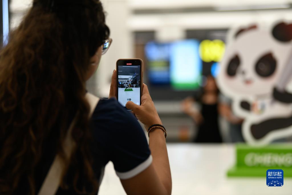 7月17日,在成都天府国际机场,抵蓉的巴西代表团成员在等候行李时拍摄机场内的大运会吉祥物“蓉宝”装饰。新华社记者 胥冰洁 摄