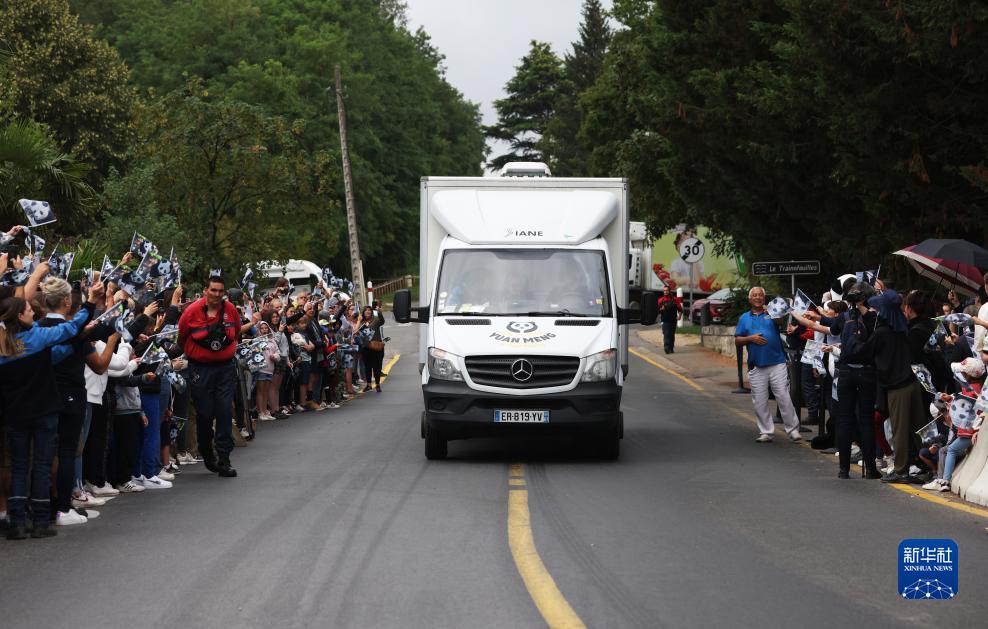 7月25日,在法国圣艾尼昂市博瓦勒野生动物园外,人们送别搭载熊猫“圆梦”的车离开。