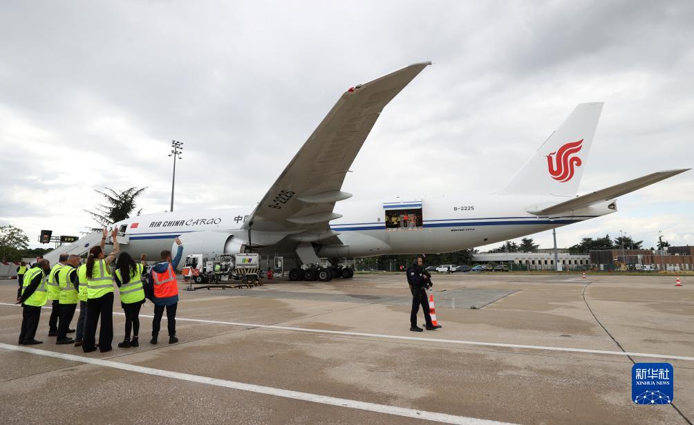 7月25日,在法国巴黎戴高乐机场,工作人员向搭载“圆梦”的飞机挥手致意。