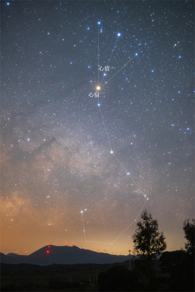 中国天文学会会员、天津市天文学会理事赖迪辉介绍,天蝎座是一个著名的黄道星座,是夏季南部天空的标志性星座,形象鲜明又醒目。心宿一是天蝎座σ星,属东方苍龙七宿的心宿。心宿一是一颗蓝巨星,位于比它更亮的红色超巨星心宿二(天蝎座α星)附近,亮度为2.9等,较适合肉眼观测。