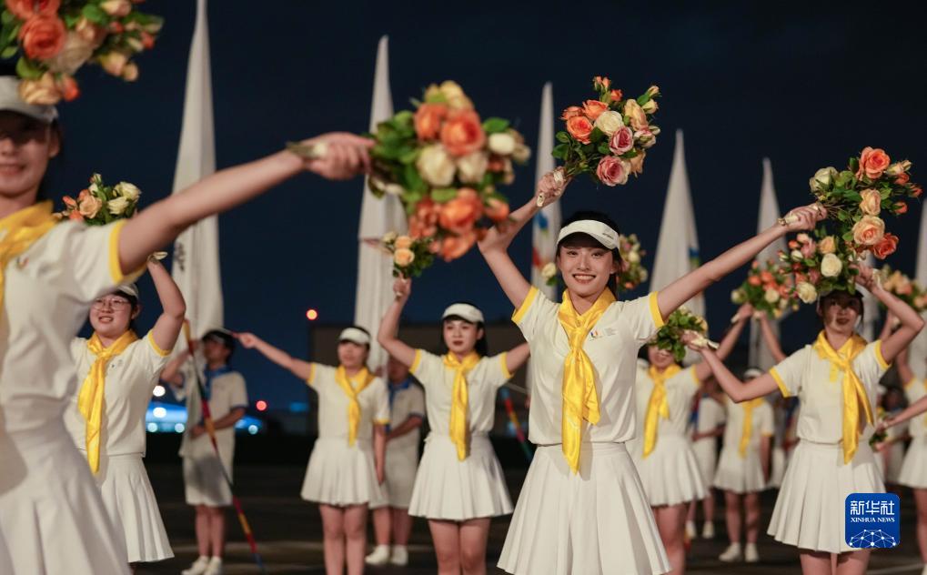 7月26日晚,来华出席成都大运会开幕式并访问的格鲁吉亚总理加里巴什维利抵达四川省成都市。这是欢迎仪式现场。新华社记者 江宏景 摄