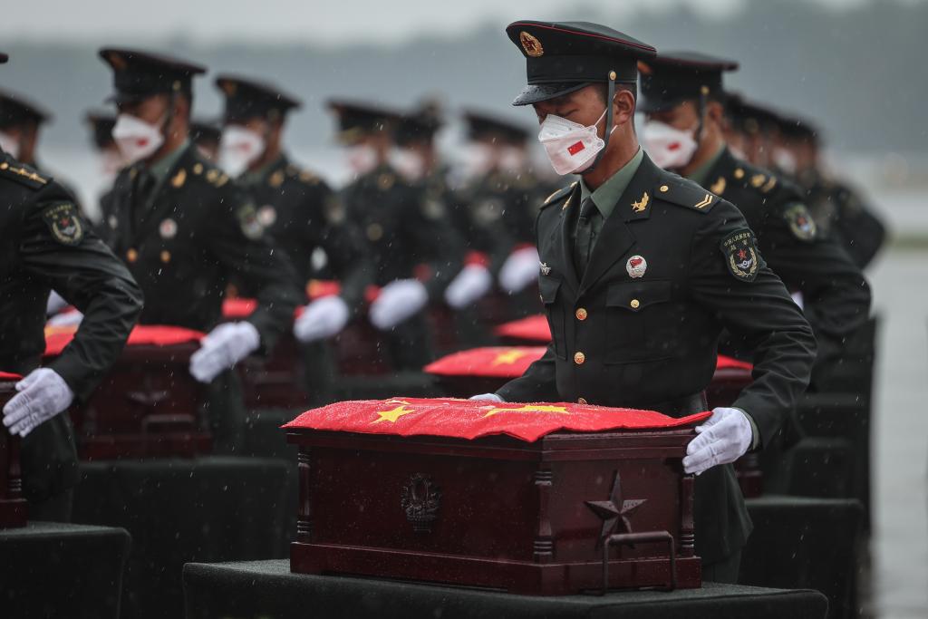 2022年9月16日,在沈阳桃仙国际机场,礼兵将殓放志愿军烈士遗骸的棺椁从专机上护送至棺椁摆放区。当日,第九批在韩中国人民志愿军烈士遗骸由我空军专机护送从韩国接回辽宁沈阳,88位志愿军烈士遗骸及相关遗物回到祖国。新华社记者 潘昱龙 摄