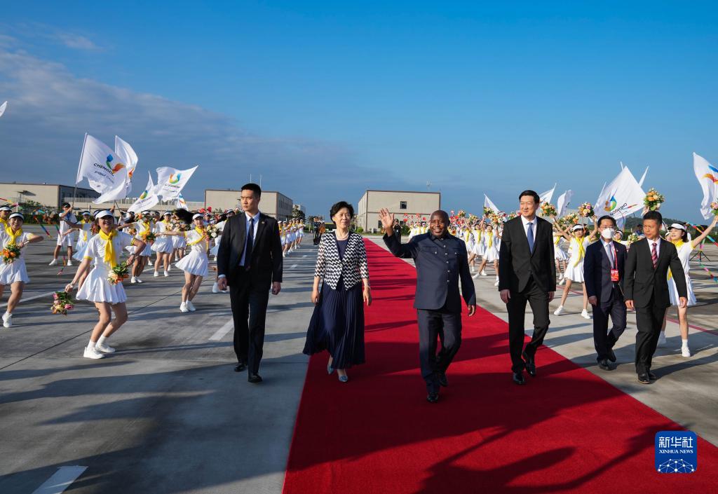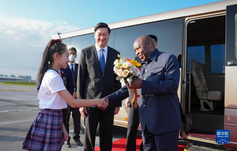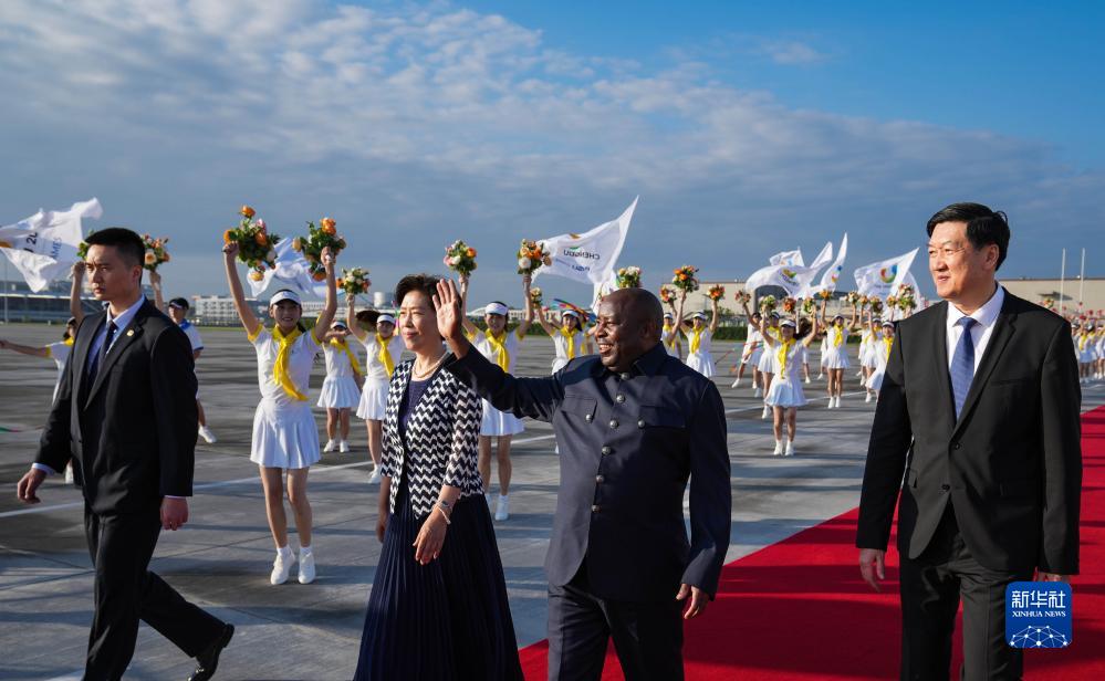 7月28日上午,来华出席成都大运会开幕式并访问的布隆迪总统恩达伊施米耶抵达四川省成都市。新华社记者 江宏景 摄