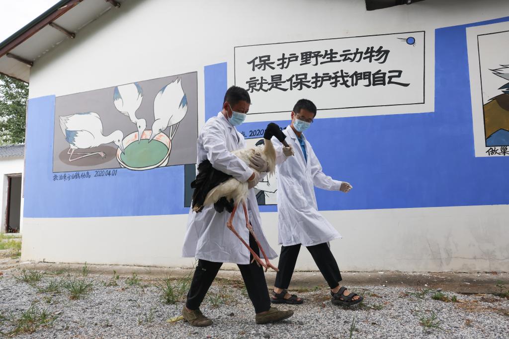 ↑在江西省野生动物救护中心,工作人员在检查东方白鹳翅膀的康复情况(7月15日摄)。