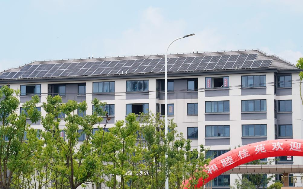 和睦佳苑小区的住宅楼顶均安装光伏板并已实现并网发电。(李心怡 摄)