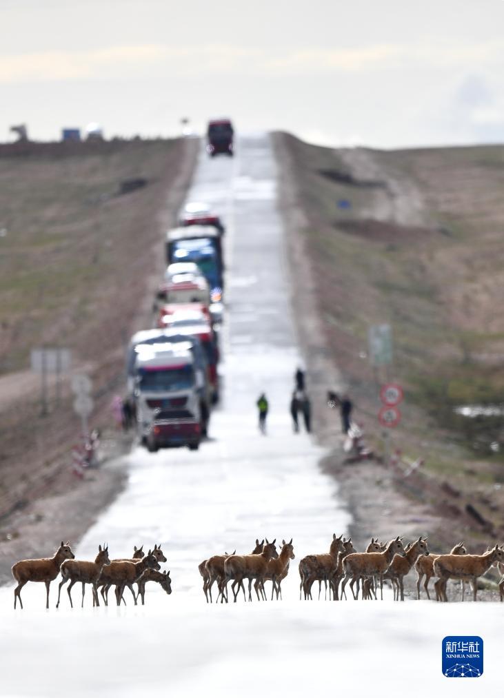 7月28日,一群藏羚羊通过青藏公路前往三江源地区的栖息地。