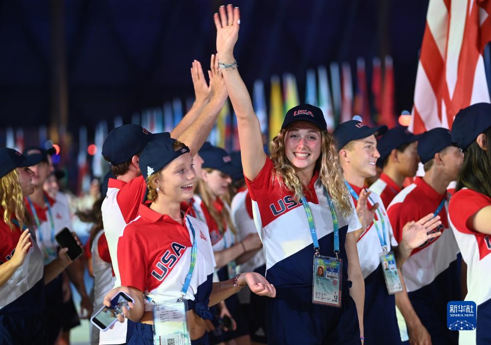 7月28日,美国大学生体育代表团在开幕式上入场。