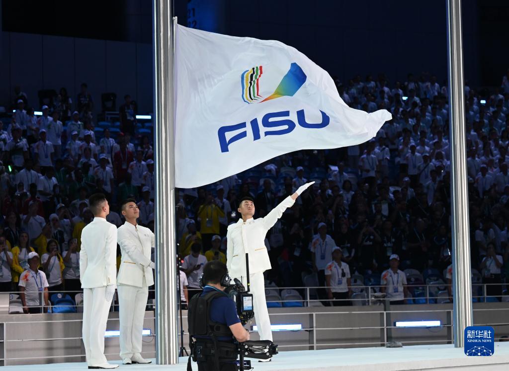 7月28日,国际大学生体育联合会会旗在开幕式上升起。