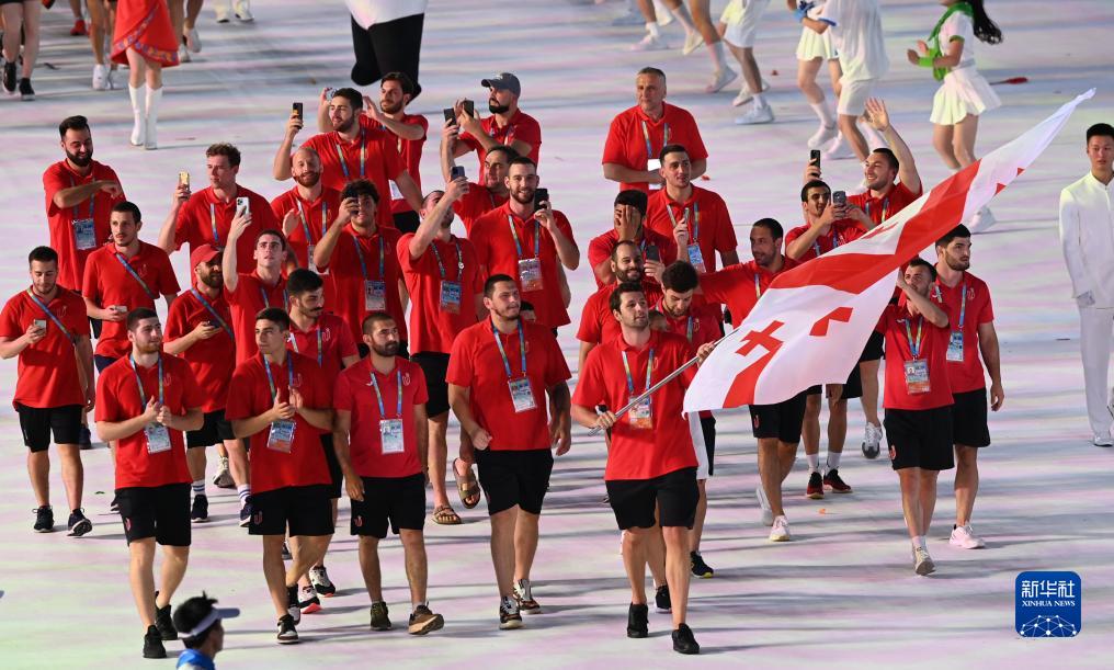 7月28日,格鲁吉亚大学生体育代表团在开幕式上入场。