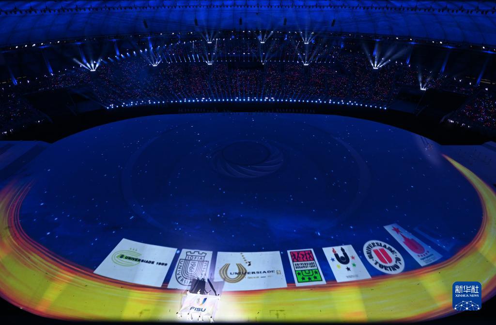 7月28日,国际大学生体育联合会会旗在开幕式上入场。