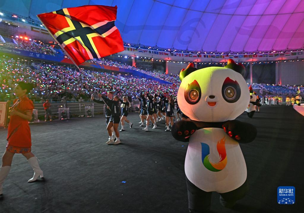 7月28日,挪威大学生体育代表团在开幕式上入场。