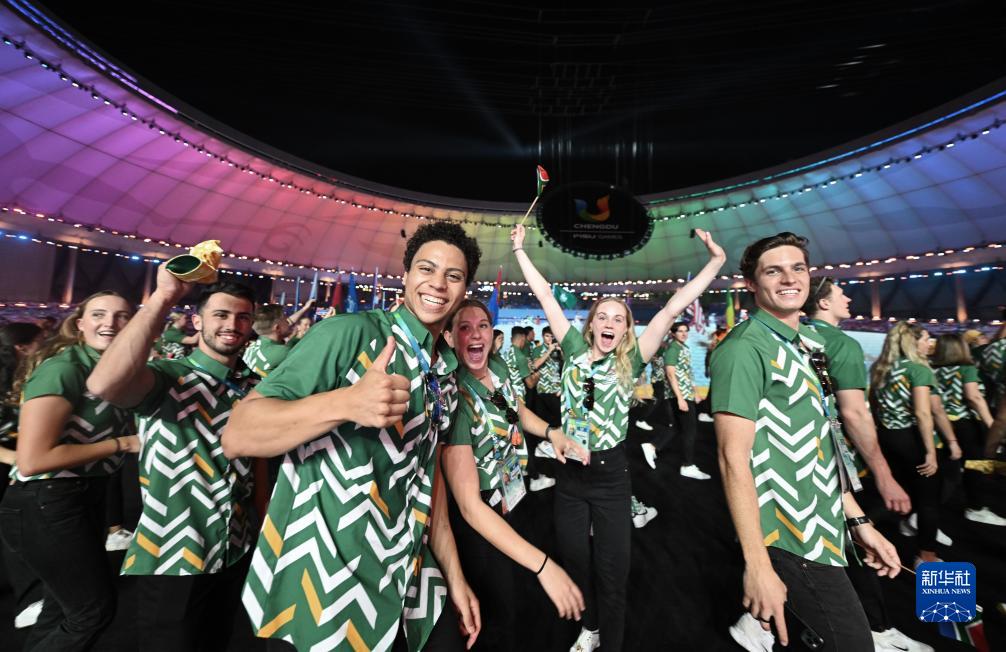 7月28日,南非大学生体育代表团在开幕式上入场。