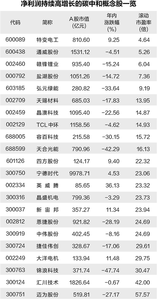 二级市场表现来看,以7月27日收盘价与年内高点相比,上述22只高增长的碳中和概念股平均回撤幅度26.15%。天合光能、锦浪科技、恩捷股份、弘元绿能、容百科技回撤幅度40%以上。