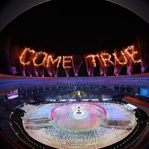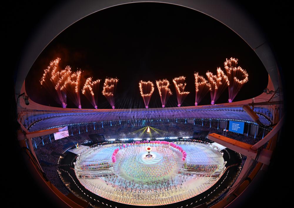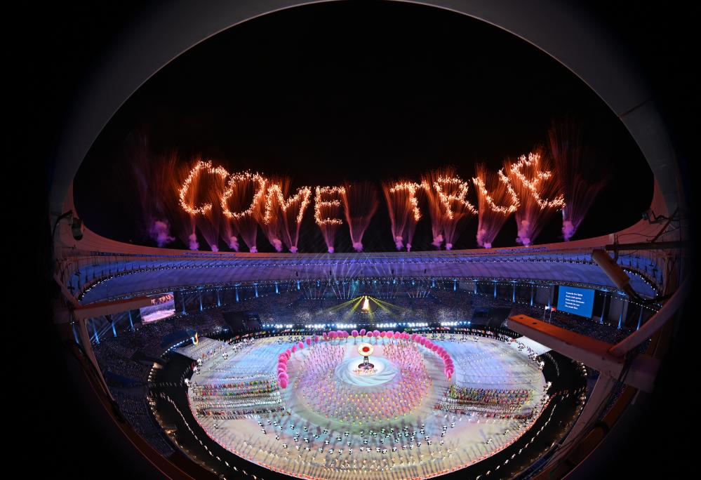成都成就梦想。随着大运会火炬塔被点燃,焰火在空中打出成都大运会的U形会徽,体育场上空焰火呈现英文字样“Make Dreams Come True”。