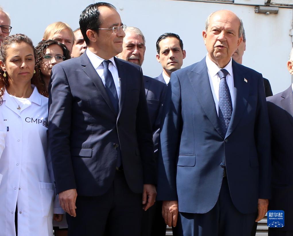 7月28日,塞浦路斯希腊族领导人、总统赫里斯托祖利季斯(前中)和土耳其族领导人塔塔尔(前右)走访位于塞首都尼科西亚的联合国缓冲区内的塞浦路斯失踪人员委员会。新华社发(乔治·克里斯托弗鲁摄)