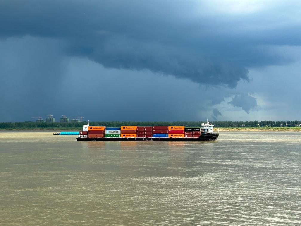 正在长江安庆段江面上航行的集装箱货轮。新华社记者吴慧珺 摄