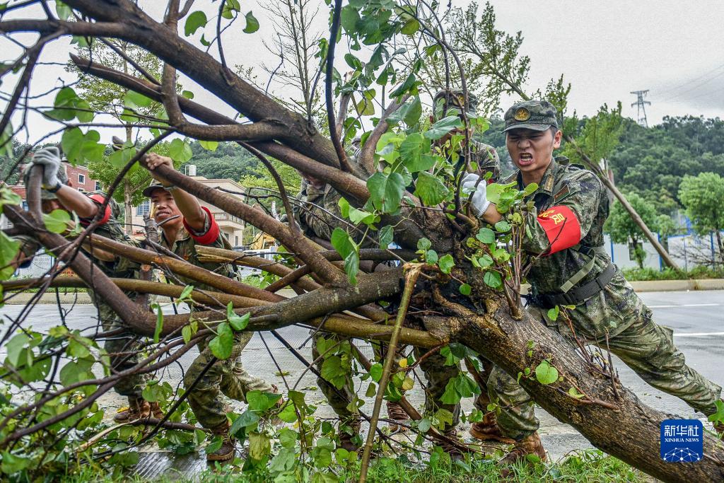 7月29日,陆军第73集团军某旅官兵在泉州市惠安县惠崇公路紧急搬运倒伏的行道树。新华社发(李冠廷 摄)