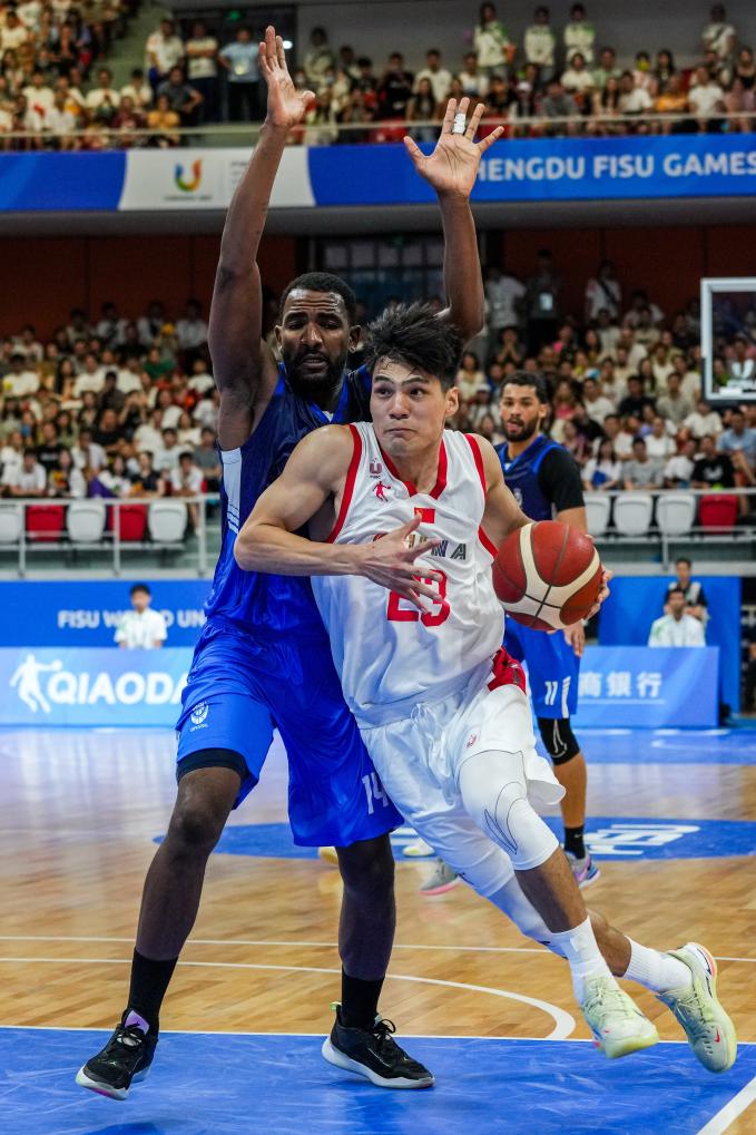 中国队首发阵容由来自广东工业大学的陈国豪和来自清华大学的王岚嵚领衔。第一节刚开始,巴西队连得5分,中国队进入状态较晚,比赛前4分钟仅得2分。全场观众“雄起”的助威声显然感染了中国队队员,在经过反复交换球权,投入第二个两分球后,中国队又投进一记三分球。首节最后1秒,中国队投进一记压哨三分,将比分追至17:20。