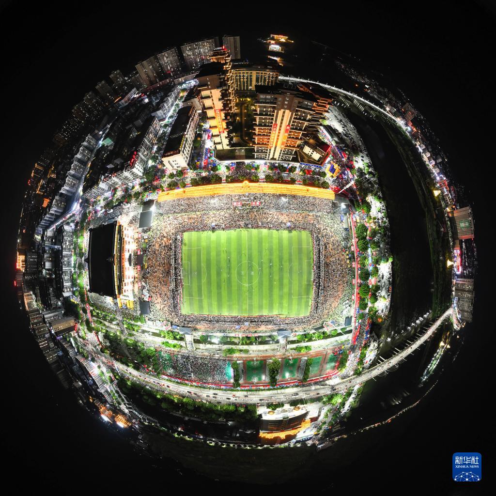 这是7月29日拍摄的夜幕下的“村超”总决赛现场(无人机全景照片)。新华社记者 欧东衢 摄