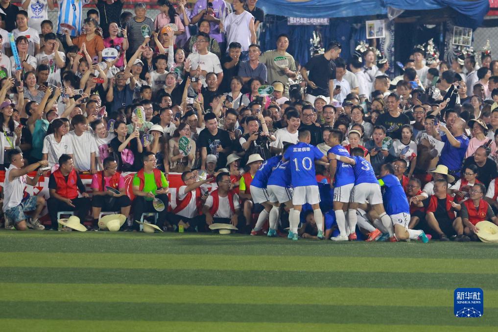 7月29日,车江一村队球员在决赛中取得进球后庆祝。新华社记者 刘续 摄