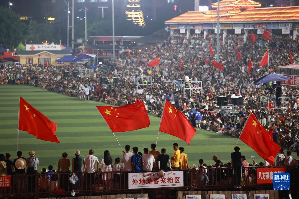 7月29日,观众们在现场挥舞国旗。新华社记者 刘续 摄