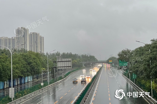 北京今晨降雨持续,路面湿滑。(图/中国天气网 王晓)