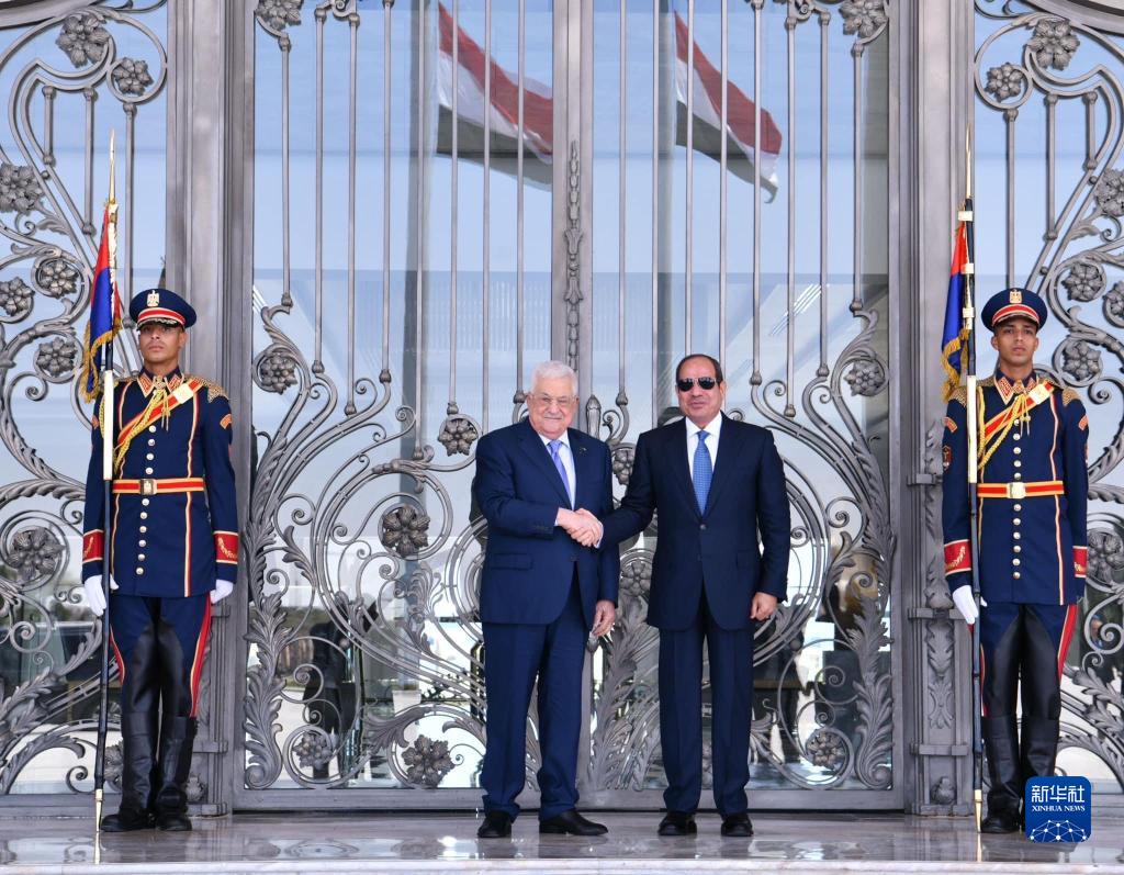 7月31日,埃及总统塞西(中右)在埃及新阿拉曼市欢迎到访的巴勒斯坦总统、巴勒斯坦民族解放运动(法塔赫)主席阿巴斯(中左)。新华社发(埃及总统府供图)