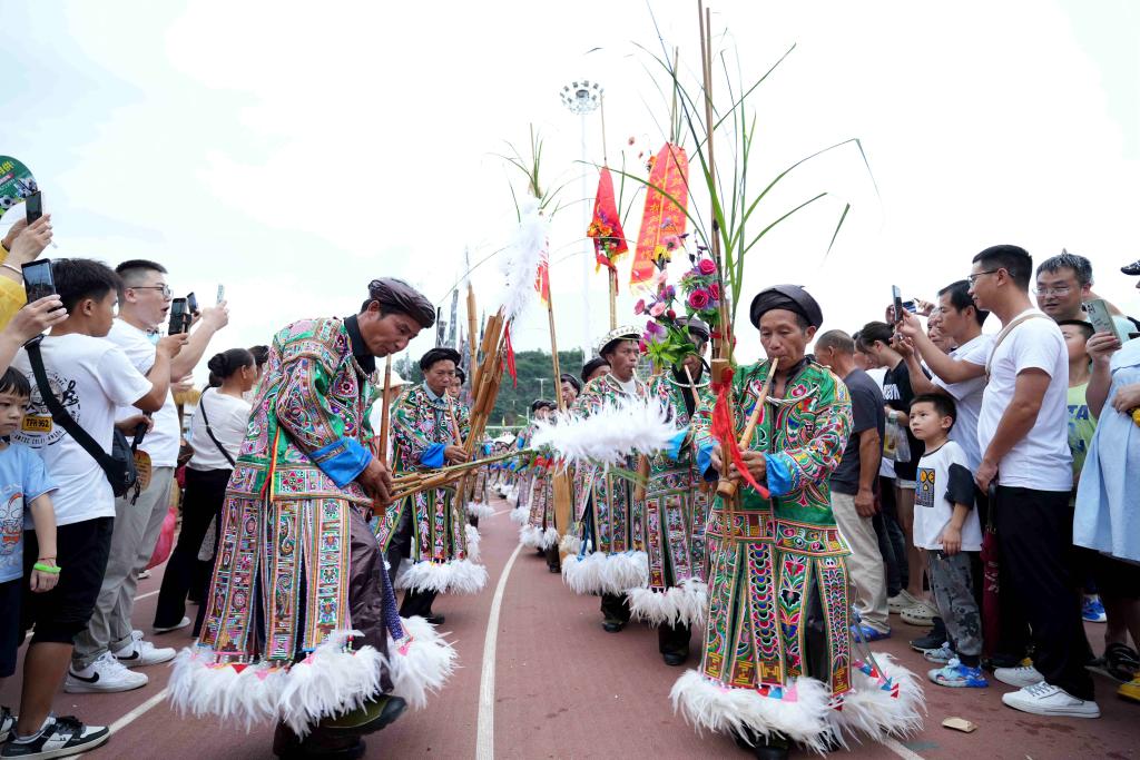 6月23日,村民自发组成的民族歌舞表演队盛装吹芦笙入场。新华社发(王炳真摄)