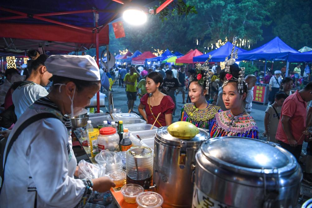 不仅是忠诚镇,“村超”足球场周围的餐饮更加火爆。当地政府设置了烧烤区、特色小吃区、冷饮区、后备箱集市区等近2000个临时免费摊位,让榕江县的夜间经济异军突起。