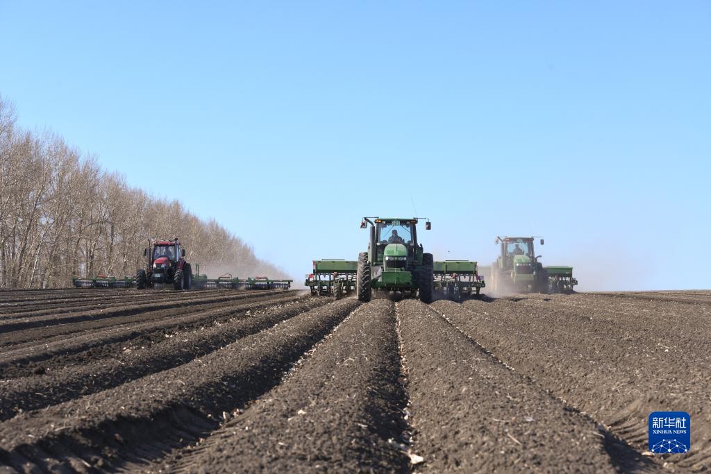 位于黑龙江省北安市的北大荒集团建设农场有限公司一处农田中,大型拖拉机在进行分层定量施肥与镇压保墒作业(4月8日摄)。新华社记者 王松 摄