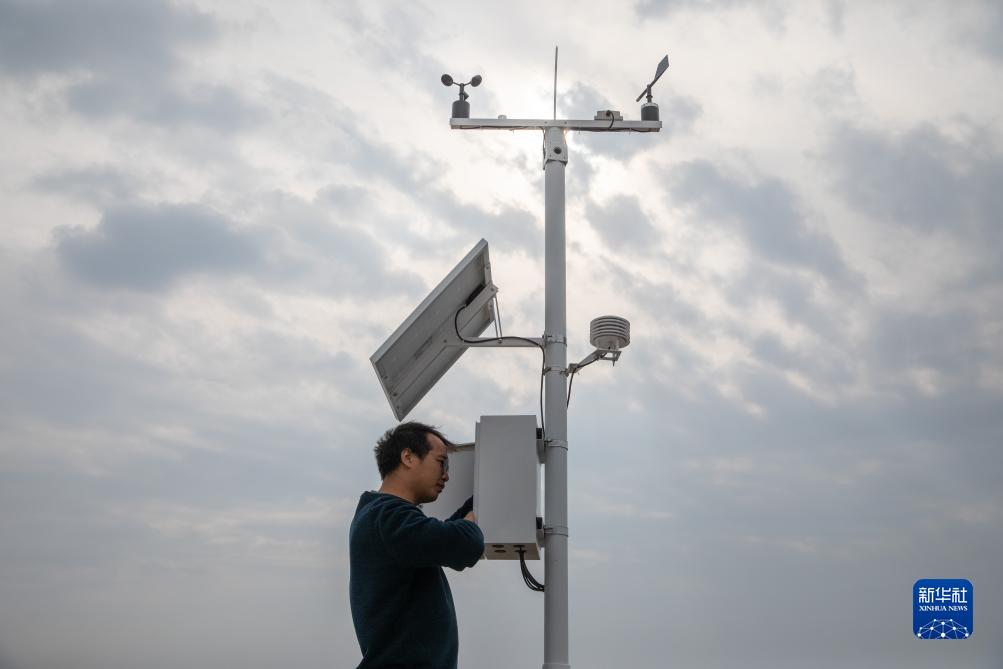在北大荒集团闫家岗农场有限公司农业现代化示范区,工作人员在调试气象设备(4月27日摄)。新华社记者 张涛 摄