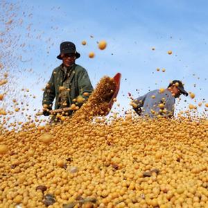 在北大荒集团北安分公司赵光农场有限公司,工作人员在一处晒场的大豆堆上忙碌(2022年10月20日摄)。新华社记者 王建威 摄