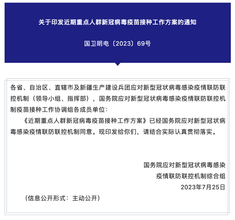 新华社北京8月1日电(记者顾天成)疫苗接种是防控新冠病毒感染疫情的重要手段。记者1日从国家疾控局获悉,为进一步做好2023年秋冬季新冠疫情应对准备,最大程度保护人民群众生命安全和身体健康,国务院联防联控机制综合组近日印发《近期重点人群新冠病毒疫苗接种工作方案》提出,对老年人等重点人群实施针对性新冠病毒疫苗接种。