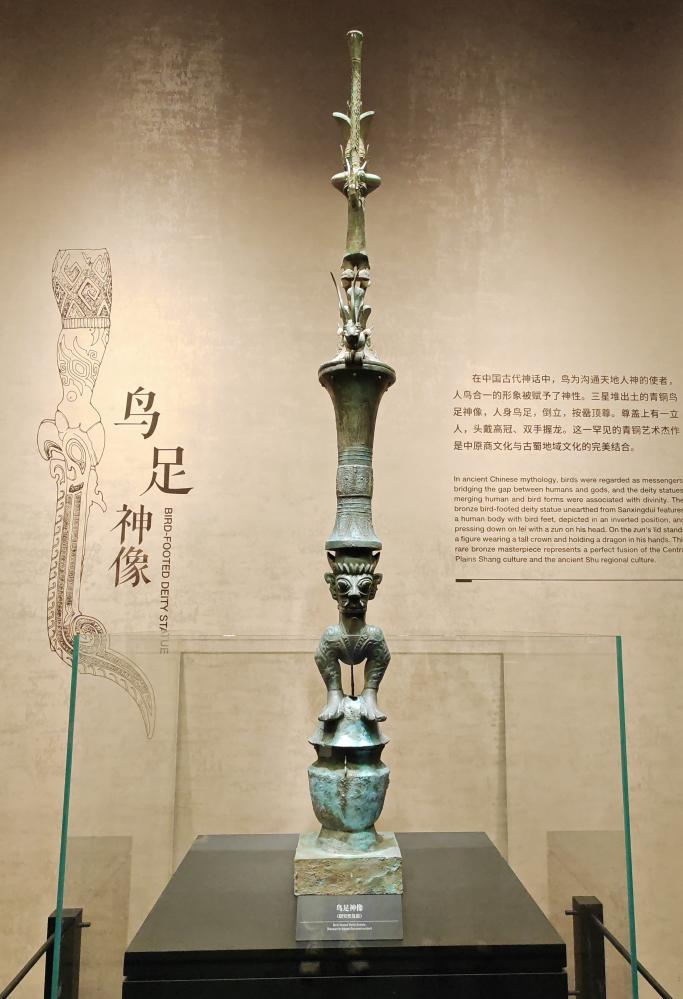 在新落成的三星堆博物馆内,有这样一件文物,融合了三星堆文明、夏商文明的典型特征,也兼具了良渚、仰韶、石家河等文明的印记,它就是青铜鸟足神像。