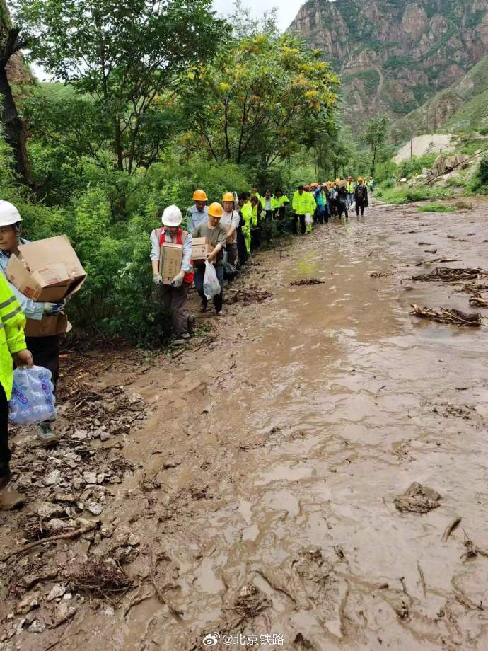 K1178次列车由银川开往北京丰台。7月31日,K1178次列车在北京门头沟遭遇暴雨,停靠在沿河城火车站。该站地势高,站内地质条件较好,旅客全部在车厢内,平安无危险。铁路部门正在协同地方政府为受困旅客供给应急食品、饮用水等生活物资。8月1日,铁路突击队人员以肩扛手提、徒步搬运的方式分批将方便面、矿泉水、火腿肠等生活物资运到列车上,12时左右发放到旅客手中。