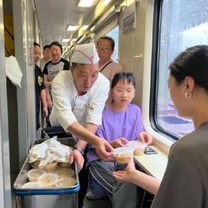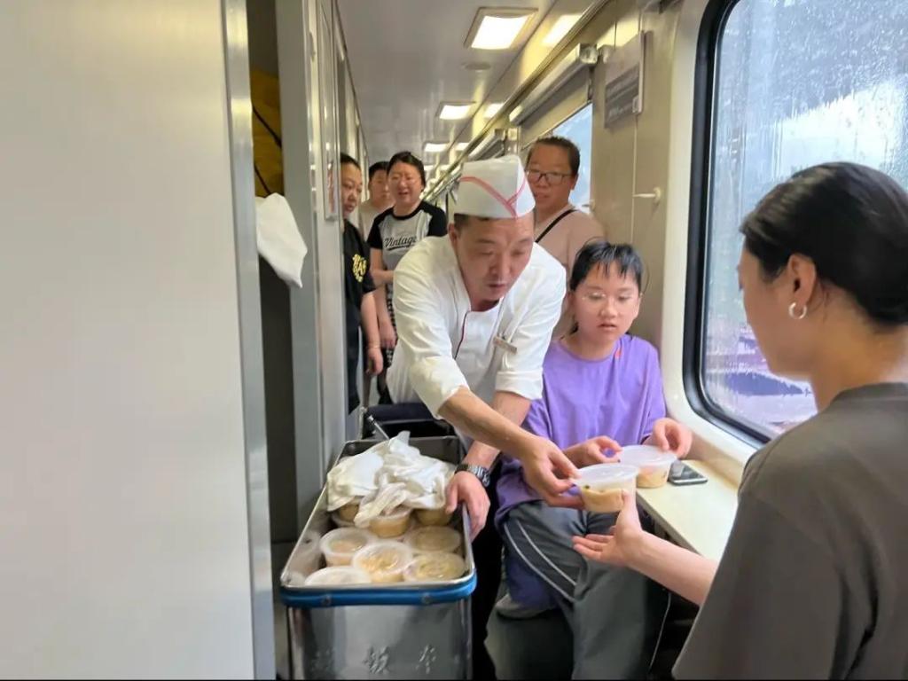 Z180次列车工作人员为旅客发放餐食。(国铁集团供图)