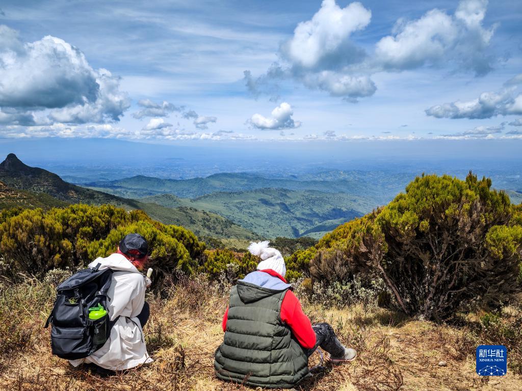 这是3月18日,两名游客在肯尼亚阿伯德尔国家公园的象山上欣赏风景。