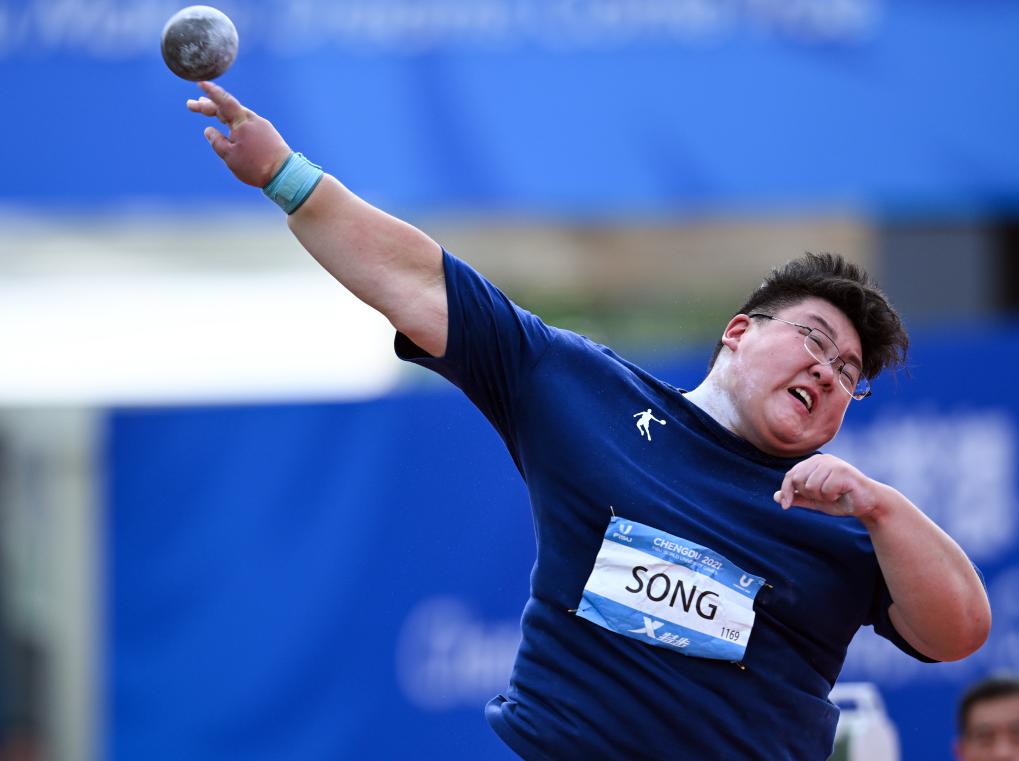 宋佳媛在女子铅球的争夺中展示出强大的统治力,她在第一投就投出18米24的成绩,奠定领先的基础。“教练给我布置的战术是要稳定一点,把第一球投好,确保有成绩。”宋佳媛的保底成绩已经让其他选手望尘莫及,此后她在第五投拿到18米56的夺冠成绩,所有选手在整场比赛只有两投超过18米,均出自宋佳媛之手。