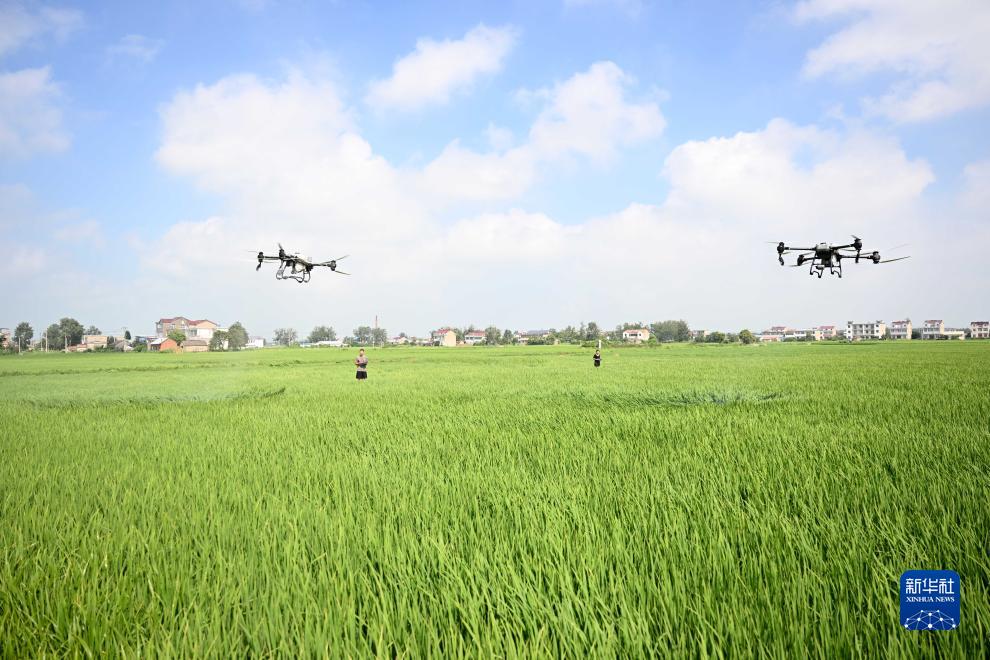 8月1日,在安徽省蚌埠市五河县浍南镇杨集村,吴家欢(左)使用无人机为水稻喷洒农药。