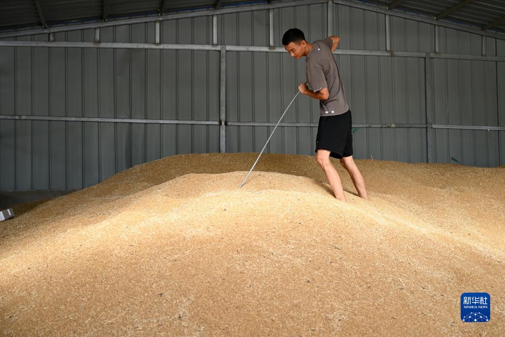 8月1日,在安徽省蚌埠市五河县浍南镇杨集村,吴家欢在查看仓库中小麦的干燥程度。